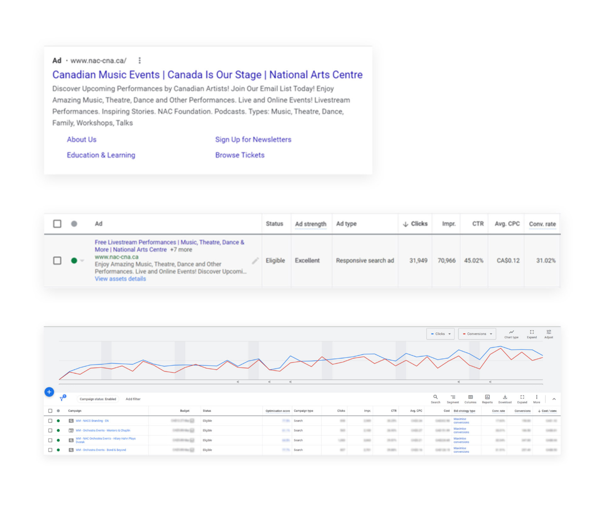 With such a large organization that needed help promoting all of their disciplines, WebMarketers conducted a complete audit of their Google Ads accounts, identified where their strengths and opportunities were, and formulated and implemented an optimization strategy. As a result, we were able to do the following for the NAC’s Google Ads campaigns: