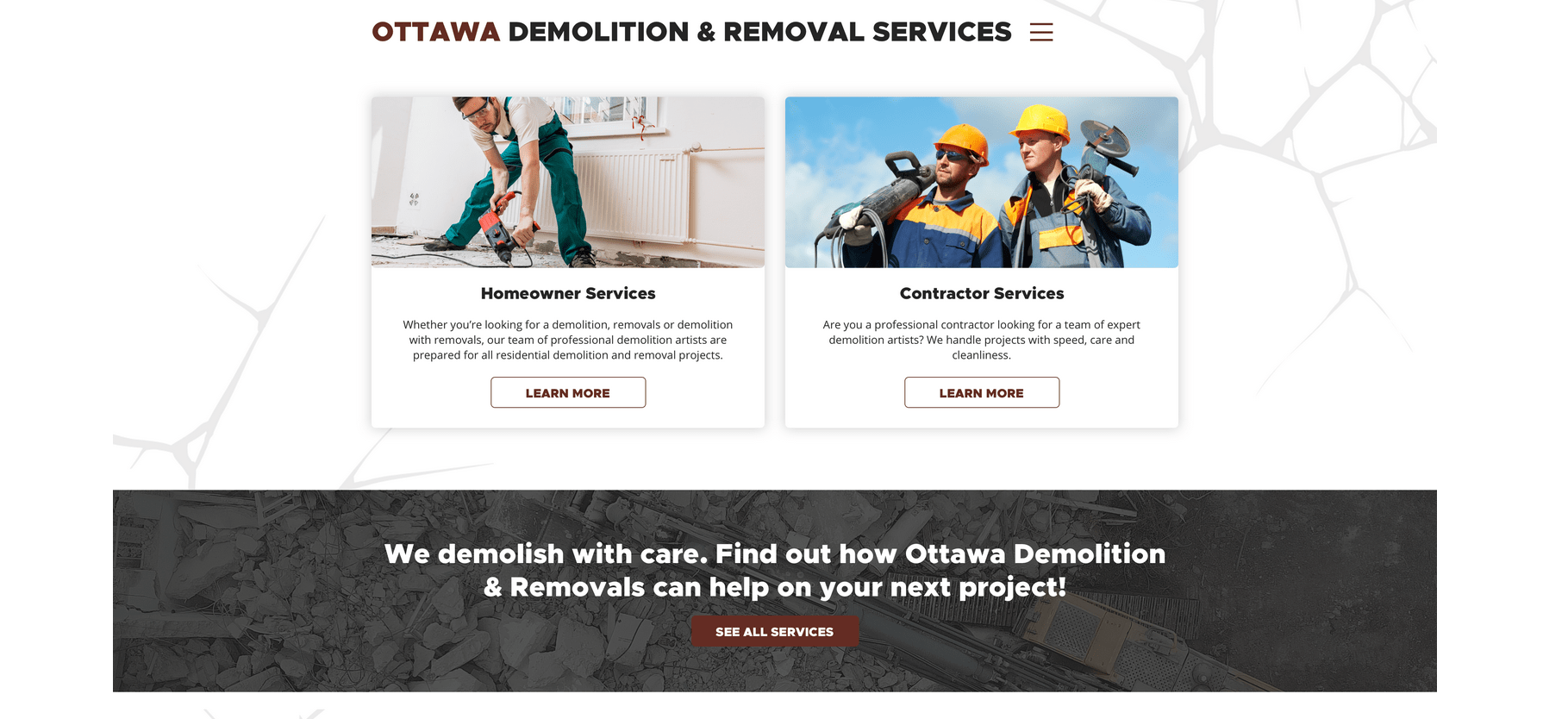 Ottawa Demolition & Removals’ site is creative in design with a strategic layout. Among all demolition websites we’ve seen – this one stands out immensely with a fresh approach to design. I’m willing to bet you didn’t think that demolition could look this clean.