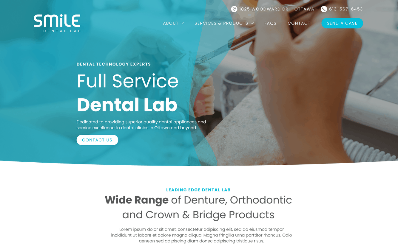 For Smile Dental Lab, a light website theme is used as the bridge between their professionalism and dental services. This design is another fantastic example of using whitespace to elevate the brand.