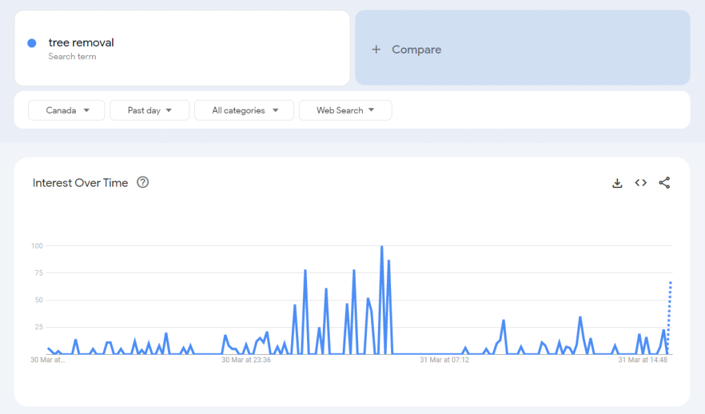 So I went beyond the data shown here and looked at previous years where I found a similar massive spike took place. Over the May long weekend, there is usually 3-4 times the search for tree removal in Ontario. The storm last year just amplified the jump.
